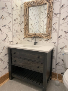 A handmade powder room vanity made of ash and stained with a dark espresso stain. The limited space in this bathroom became functional with the addition of our carefully designed and built vanity. With slow-close drawer slides and a custom drawer box made to go around the plumbing, this vanity serves it's intended purpose quite well.
