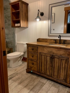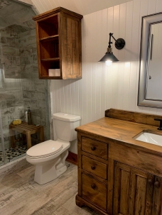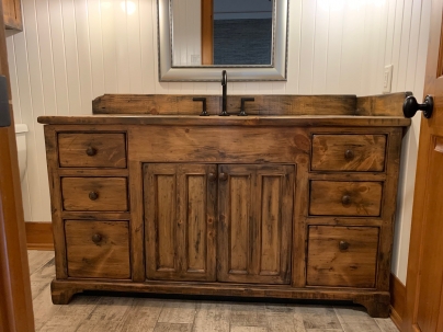 A pine vanity that we were commissioned to design and build for a Muskoka cottage. With lot's of interesting details and small design elements this vanity "reads" old, however it functions just as well as any modern styled vanity. Details such as beading around drawers and doors, recessed panel doors with panel moulding, and a pine top all add up to create a ton of character. The top is finished with an outdoor polyurethane finish to resist moisture and the drawers all have modern slow close drawer slides. A small wall cupboard made in the same style was added for extra storage.