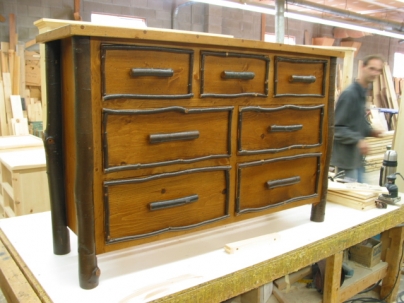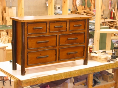 Made like our original and log chests but with log legs with the bark still on. Small log trim around drawers and v-joint panel doors in the night table along with a custom stain make this a particularly nice option for cottage bedroom furniture.