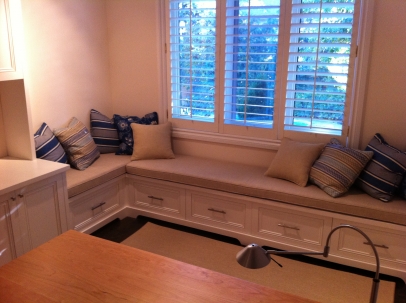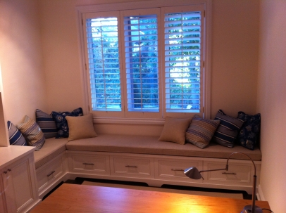 A custom L-shaped window bench for this office included cabinets made from clear hardwoods, a solid white finish, slow-close drawers and hanging file storage systems. Custom made cushions and throw pillows complete the piece, add a splash of cover and help to soften up the look.