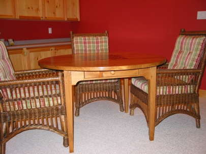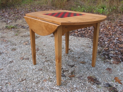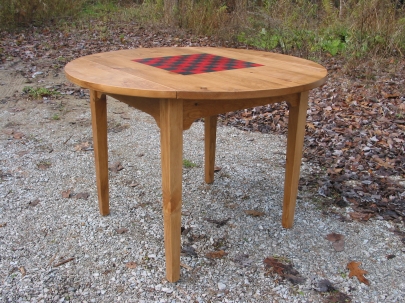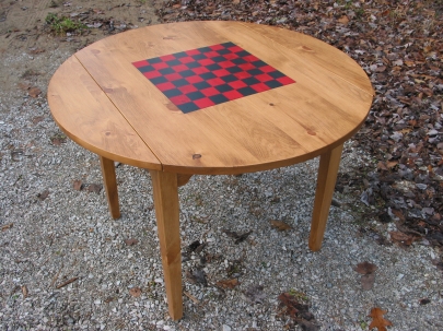 This version of our round games table had optional drop leaves to allow it to tuck into a small space at a clients cottage. There is a storage drawer cut into the skirt to allow storage of playing pieces and cards and of course a hand-painted checker board top. Made from pine and stained with our own antique stain followed by multiple coats of our hand-rubbed lacquer finish.