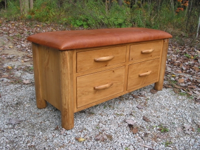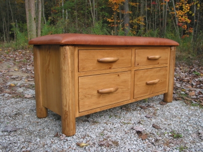 Commissioned by a client for the entry of his ski chalet this custom bench has our hand-hewn log legs, flush fitting drawers and a distressed/natural leather upholstered top.