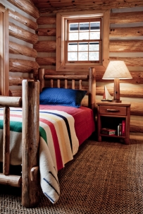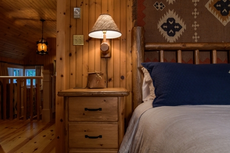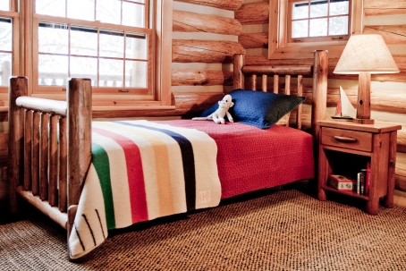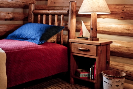 Similar to our log bed this variation employs hand carved vertical log spindles. Handsome and strong it makes a wonderful focal point for a bedroom. Made of pine logs, each log is knife carved by hand to a pleasing texture and then joined using our mortise and tenon joinery to make single, double, Queen, or king size beds.