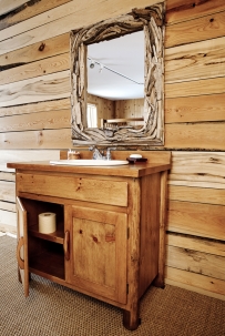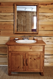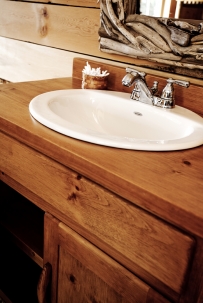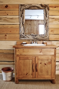 Our log vanity is built with the same care and incorporates the same details as our log construction furniture. A satisfying combination of fine cabinet work and hand-hewn log legs create not just a vanity, but a piece of furniture for your bathroom. The wooden top has a tough and durable marine finish that resists water. Ask us to design a custom vanity for your next project!