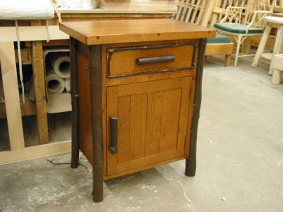 Made like our original and log chests but with log legs with the bark still on. Small log trim around drawers and v-joint panel doors in the night table along with a custom stain make this a particularly nice option for cottage bedroom furniture.