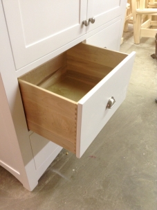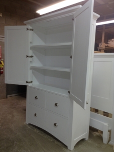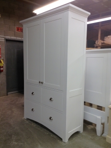 A rather large shaker style armoire that we designed and constructed to store plenty of clothes. The upper portion has adjustable shelving while the lower section functions as a four drawer dresser. The drawers are made from maple using dovetail joinery and all open and close easily with slow/self close drawer slides. The entire cabinet was made from a clear hardwood and finished with a hand-rubbed soft white finish.