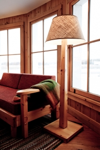 Scaled and shaped much like a tree this is a cottage lamp. It's tall with a wide shade and a solid brass tri-light socket. The base is wide and heavy so that it will likely never be knocked over.