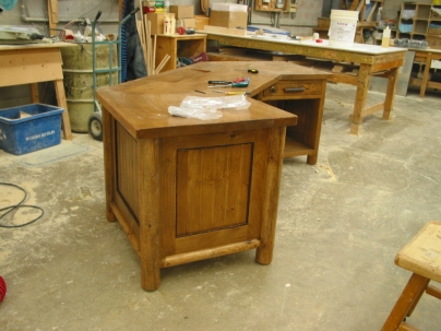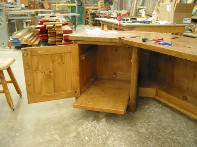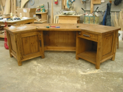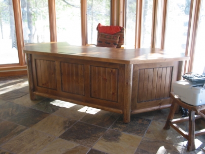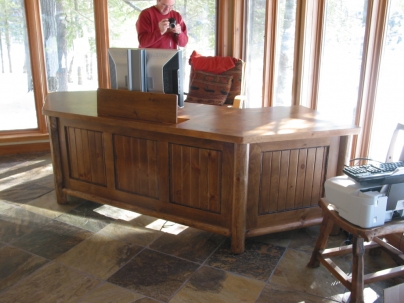 A custom desk built for a Lake Rosseau cottage. Made with log legs, dogwood trim, v-joint panels and doors, lockable doors, keyboard tray and an electric lift for the monitor. The angled shape of the desk creates options for different views to the lake.