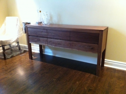 This sideboard was designed to go with a custom walnut dining table. Our contemporary design included slow-close drawer slides, straight legs, and incorporated drawer pulls into the drawer faces. Crafted from solid black walnut and finished with our hand-rubbed lacquer finish.