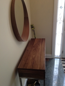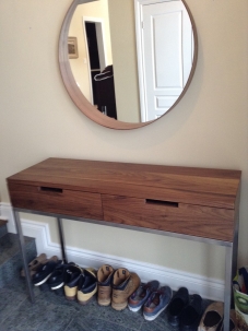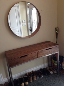 A custom designed entry/console table made with a stainless steel base and a solid walnut cabinet section. The drawers have their pulls cut into the drawer faces in keeping with the minimalist design. Made from solid black walnut and finished with our hand-rubbed clear lacquer finish.
